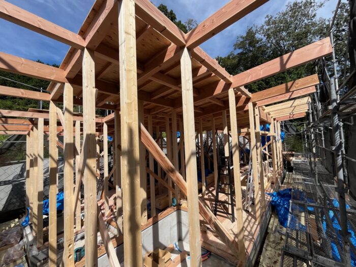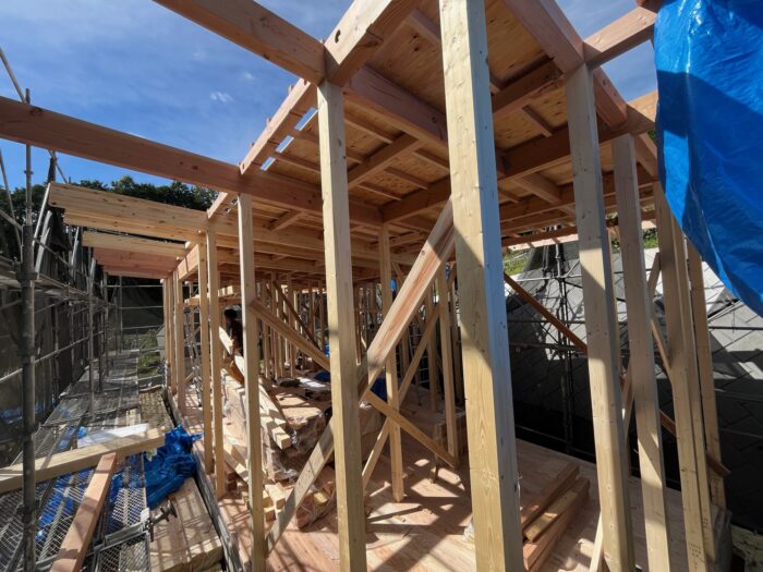 天井が高いシンプルな平屋住宅で、上棟の日にもそのデザインの美しさが感じられます。