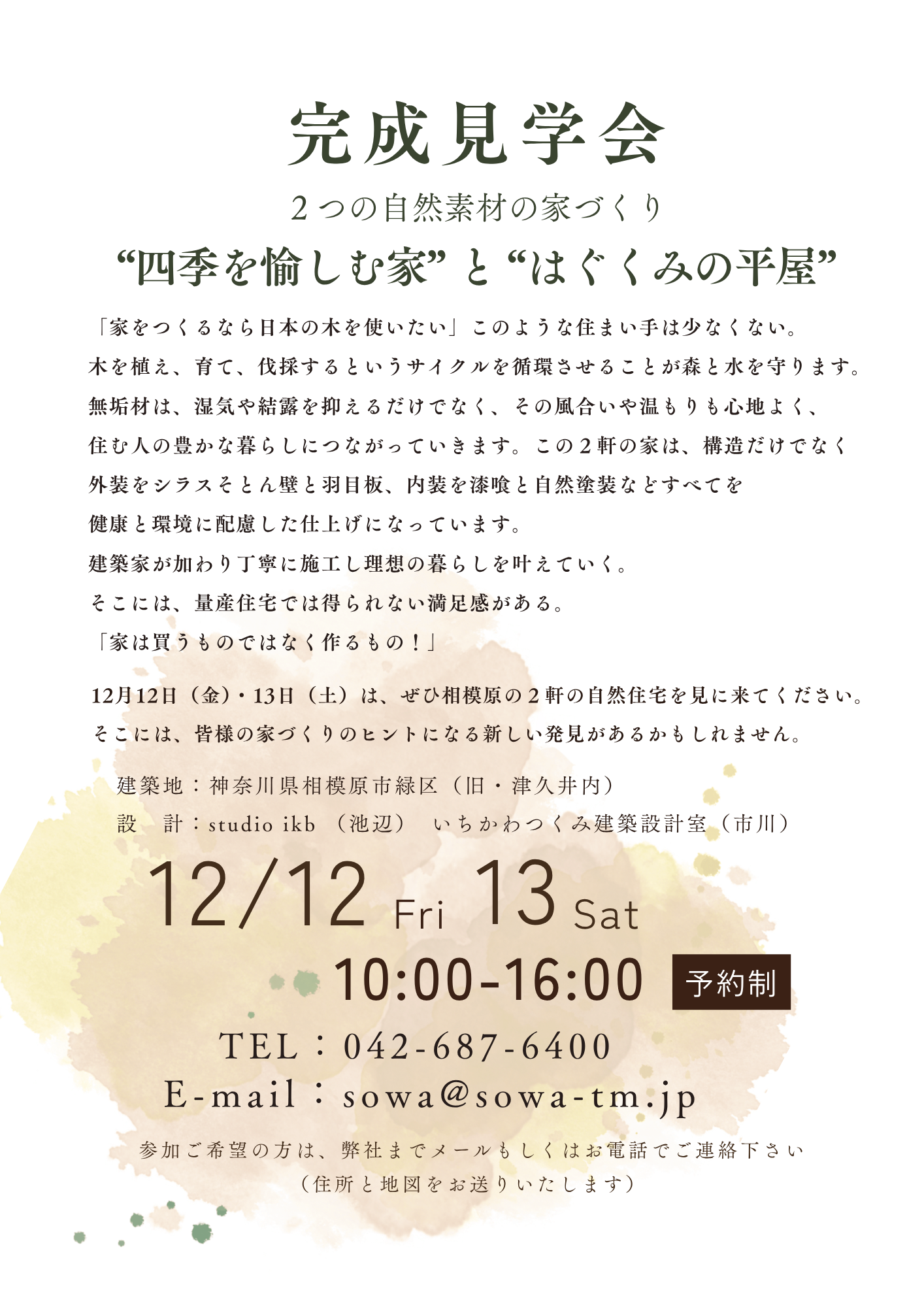 創和建設の地元、相模原市緑区にて2軒の自然住宅の完成見学会が開催されます。